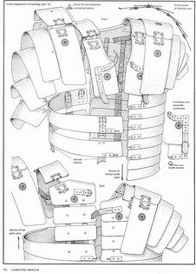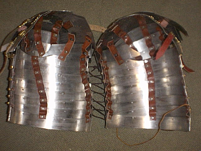 The most well known armour associated with the Romans was plate armour 'Lorica Segmentata' this was a series of metal plates joined with hinges & rivets on the outside with leather strapping on the inside to aid flexibility. It was expensive & more complex to make. It is divided into 4 quarters 2 shoulder pieces and 2 thoracic pieces joined together with leather straps and buckles. |