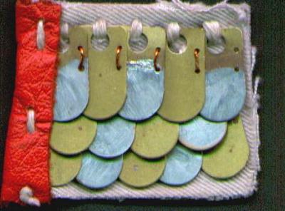 The final type of metal armour is scale armour 'Lorica Squamata' this was a series of scales sewn on cloth to form a vest or shirt like chain mail, it looked like fish scales when complete with each one over lapping the next. It was mainly worn my senior ranks or for ceremonies but could be used in battle. |