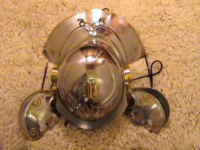 | The helmet 'Cassis' for this period was known as the imperial Gallic type E. It offered good all round protection including cheek plates & neck guard. The helmet style changed many times throughout the Roman period including some Middle Eastern styles and different metals were used thorough the periods. |