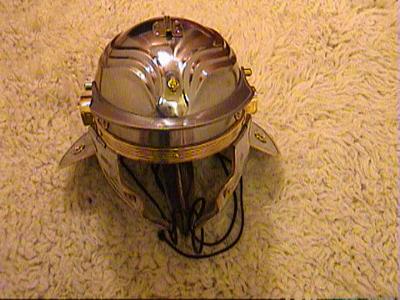 Front view of helmet showing the rigid brow guard that offered some protection from frontal blows. It was also used as a weapon in close combat with a head butt to the enemies face to stun them before further attack with a sword. |